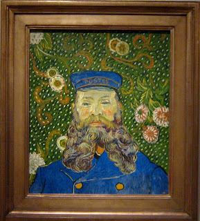 The Starry Night, hangs near this portrait, and steals all the attention away from it, which is fine with me, because it gives me more room to stare at the strange and beautiful head with its curly beard and feminine floral background. My favorite painting subject is the portrait--people's faces are the most interesting landscape there is--and Van Gogh imbues this one with all his roiling emotion, marrying a long tradition of stark German and Dutch portraiture with the vibrant colors and joyous mood of the South of France. The form of Roulin is solidly placed in the center of a whimsical background, perhaps mirroring the dynamics of the friendship between the old stolid postmaster and the mentally tormented young artist.